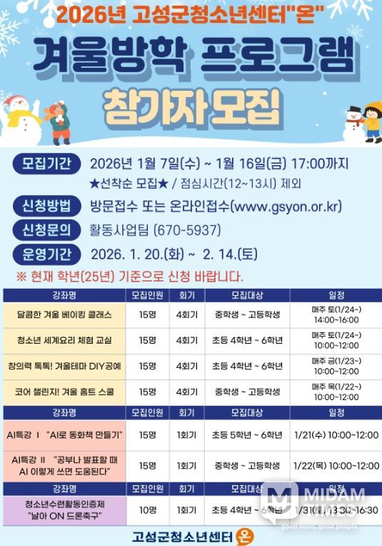 미담타임스 김교환 기자 | 고성군청소년센터“온”은 겨울방학을 맞이한 관내 청소년들을 대상으로 2026년 1월 20일부터 2월 14일까지 2026년 겨울방학 프로그램 및 특강을 운영한다.
