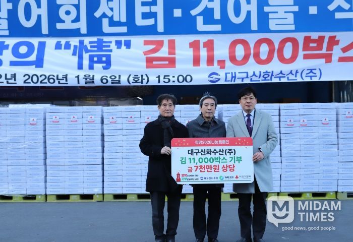 미담타임스 김교환 기자 | 대구농수산물도매시장 내 대구신화수산(주)(대표 고중근)은 1월 6일 대구농수산물도매시장에서 대구사회복지공동모금회를 통해 김 1만 1천 박스(7천만 원 상당)를 기부했다.