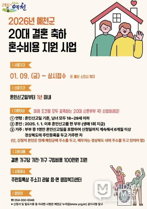 미담타임스 김준완 기자 | 예천군은 20대 신혼부부들을 위한 ‘결혼 축하 혼수비용 지원사업’을 올해도 추진한다.