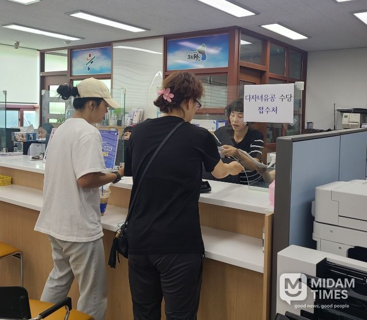 지급 절차는 해당 연령의 자녀가 있는 다자녀 부모 중 1명이 읍·면사무소를 방문해 신청서를 작성하고, 수당 전용 카드를 수령하면 다자녀 및 지원 요건 검증 후 다음 달 7일 이내 수당이 지급된다.