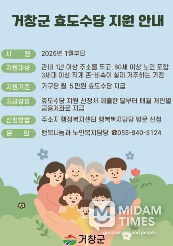 미담타임스 김교환 기자 | 거창군은 경로효친의 건전한 가족제도 정착과 효 문화 확산을 위해 효도수당 지원 대상을 확대하고, 2026년 1월부터 본격 지급에 나선다.