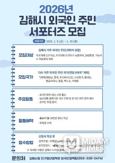 미담타임스 김교환 기자 | 김해시가 외국인주민의 시정 참여를 활성화하고 지역사회 정착을 돕기 위해 ‘제2기 김해시 외국인주민 서포터즈’를 모집한다고 9일 밝혔다.