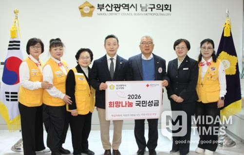 미담타임스 김교환 기자 | 부산광역시 남구의회는 1월 9일 오전 9시 30분, 남구의회 2층 의장실에서 '2026년도 적십자 희망나눔성금 모금 전달식'을 개최하고 대한적십자사 부산광역시지사에 성금 100만원을 전달했다.