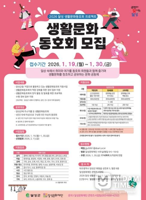 미담타임스 김교환 기자 | (재)달성문화재단은 1월 19일부터 30일까지 ‘2026 달성 생활문화동호회 프로젝트’에 참여할 동호회를 모집한다고 9일 밝혔다.