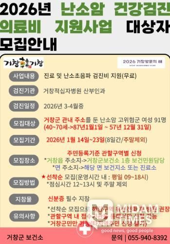 미담타임스 김교환 기자 | 거창군은 여성암 사망률 1위로 꼽히는 난소암의 조기 발견과 치료율 제고를 위해 '2026년 난소암 건강검진 의료비 지원사업'을 실시하고, 오는 14일부터 23일까지 8일간 관내 주소를 둔 거창군민 중 고위험군 여성(40~70세)을 대상으로 희망자 91명을 선착순 모집한다.