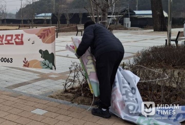 미담타임스 김준완 기자 | 금산군은 지난주 교통 및 보행 안전 확보와 쾌적한 도시경관 조성을 위해 불법 현수막 1830여 개를 수거했다.