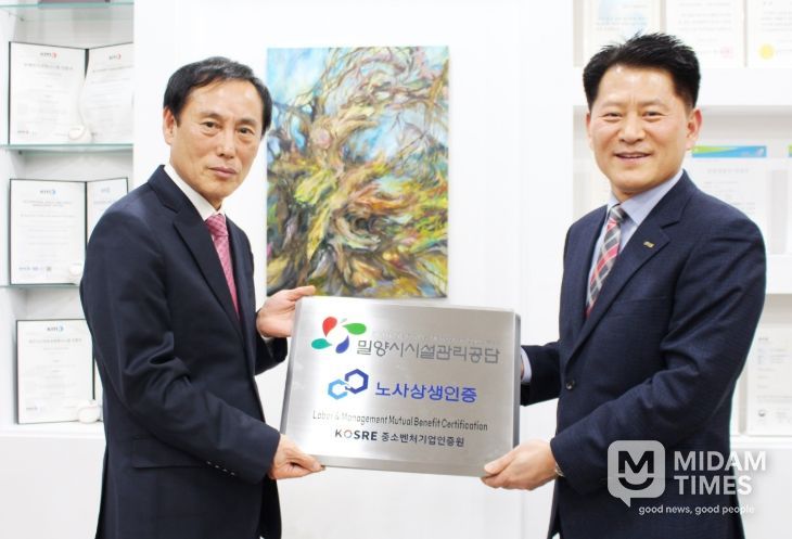 미담타임스 김교환 기자 | 밀양시시설관리공단은 13일 공단 이사장실에서 중소벤처기업인증원으로부터 획득한 ‘노사상생 인증(LMBC)’ 현판 수여식을 개최했다.