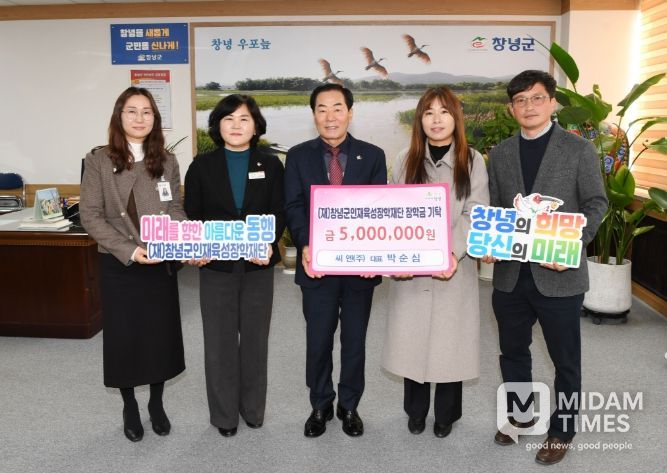 미담타임스 김교환 기자 | 창녕군은 지난 13일 씨엔(주) 박순심 대표가 지역 인재 육성을 위한 장학금 500만 원을 (재)창녕군인재육성장학재단(이사장 성낙인 창녕군수)에 기탁했다고 밝혔다.