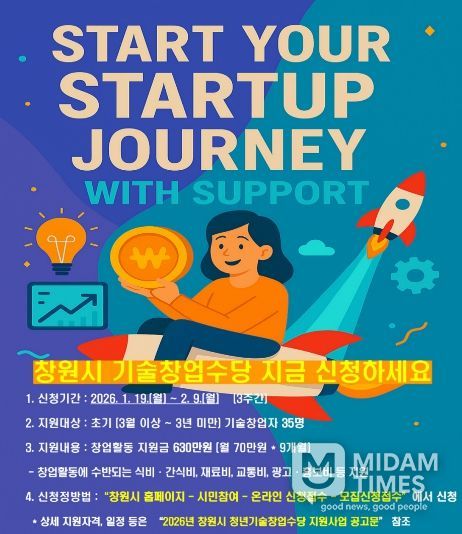 미담타임스 김교환 기자 | 창원특례시는 1월 19일부터 2월 9일까지 ‘2026년 청년기술창업수당 지원사업’ 참여자 35명을 모집한다고 밝혔다.