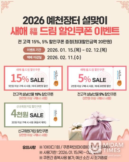 미담타임스 김준완 기자 | 예천군은 농특산물 온라인쇼핑몰 ‘예천장터’에서 다가올 설 명절을 맞아 15일부터 2월 12일까지 설맞이 특별판매전을 진행한다.