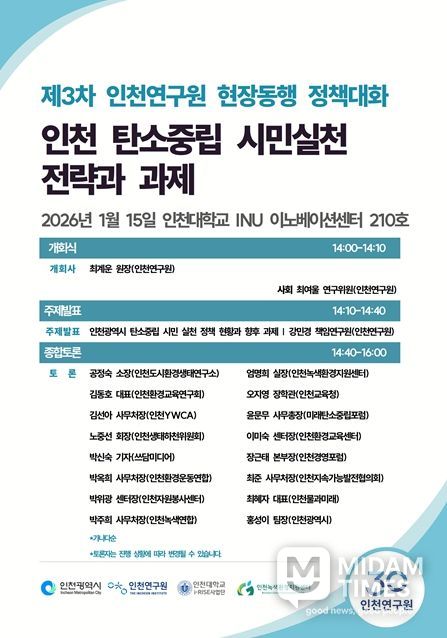 미담타임스 김준완 기자 | 인천연구원은 인천대학교 RISE사업단, 인천녹색환경지원센터와 함께 1월 15일 오후 2시, 인천대학교 INU 이노베이션센터 210호에서 정책토론회를 공동 개최한다.