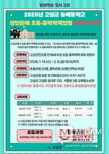 미담타임스 김교환 기자 | 고성군은 학력 취득을 희망하는 성인 학습자를 위한 학력인정 문해교육 프로그램인 ‘고성군 늘배움학교’의 2026학년도 입학생을 모집한다.