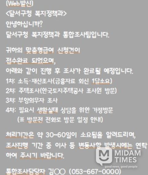 미담타임스 김교환 기자 | 대구 달서구는 맞춤형 복지급여(생계·의료·주거·교육) 신청인을 대상으로 조사 진행 상황을 안내하는 ‘알림톡 서비스’를 2026년에도 확대 시행한다.