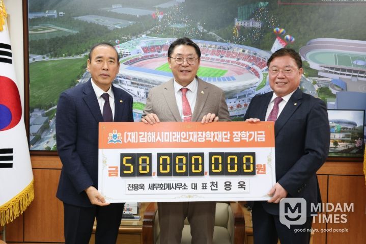 미담타임스 김교환 기자 | 김해시미래인재장학재단은 15일 천용욱 세무회계사무소에서 올해부터 5년간 5,000만원을 기탁하기로 했다고 밝혔다.