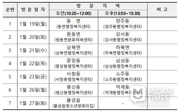읍·면·동별 일정은 19일 동면(오전)·양주동(오후)을 시작으로, 20일 원동면(오전)·강서동(오후), 21일 상북면(오전)·하북면(오후), 22일 중앙동(오전)·삼성동(오후), 23일 서창동(오전)·소주동(오후), 26일 평산동(오전)·덕계동(오후)을 거쳐, 27일 물금읍(오전)에서 마무리될 예정이다.