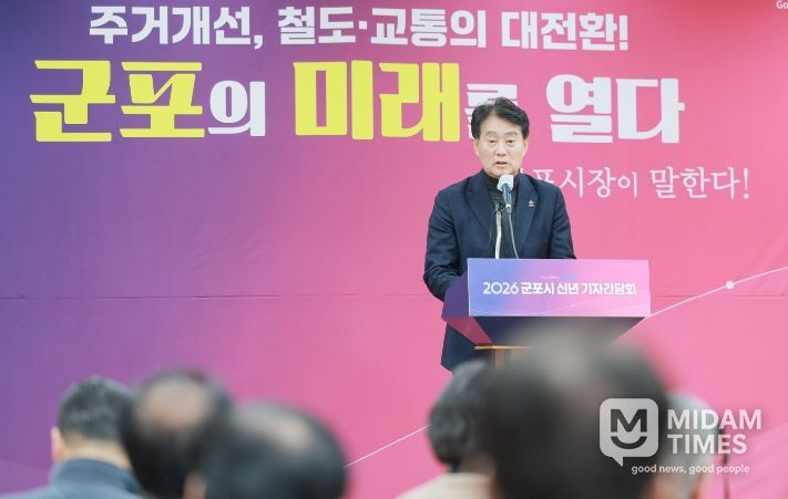 미담타임스 정주환 기자 | 군포시는 1월 15일 시청에서 기자간담회를 열고 2026년 시정운영 목표와 주요 추진 과제를 설명했다.