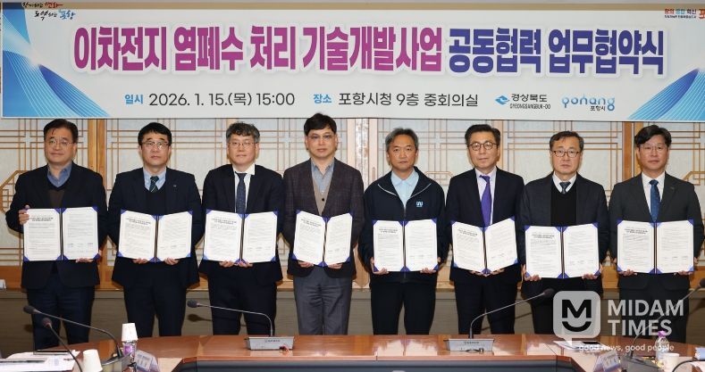 미담타임스 김준완 기자 | 포항시는 15일 시청 중회의실에서 이차전지 염폐수 처리를 위한 기술개발 공모사업에 대비한 ‘이차전지 염폐수 처리 기술개발 공동협력 업무협약’을 체결했다.