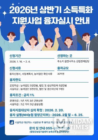 미담타임스 김교환 기자 | 함양군은 농업인의 경영개선과 농업 경쟁력 강화를 위한 ‘2026년 상반기 소득특화지원사업’을 시행하고, 오는 2월 4일까지 융자신청을 받는다.