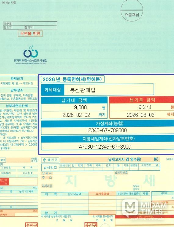 미담타임스 김준완 기자 | 울진군은 2026년도 1월 정기분 등록면허세(면허분) 12,028건에 대해 1억 4천 8백만 원을 부과했다.