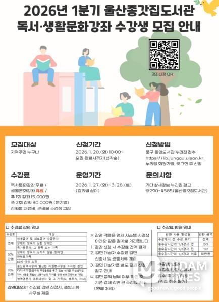 미담타임스 김준완 기자 | 울산 중구에서 운영하는 울산종갓집도서관이 2026년 1분기 독서·생활문화강좌 수강생을 모집한다