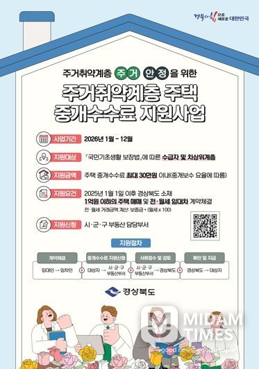해당 사업은 ‘경상북도 주택의 중개보수에 관한 조례’가 2025년 1월 1일 개정‧시행됨에 따라, 2025년 1월 1일 이후 경상북도에 소재한 1억 원 이하 주택의 매매 또는 임대차(전‧월세) 계약을 체결하고 전입신고를 완료한 주거취약계층을 대상으로 하며, 주거 이전에 소요되는 주택 중개보수 비용을 최대 30만원까지 지원한다.