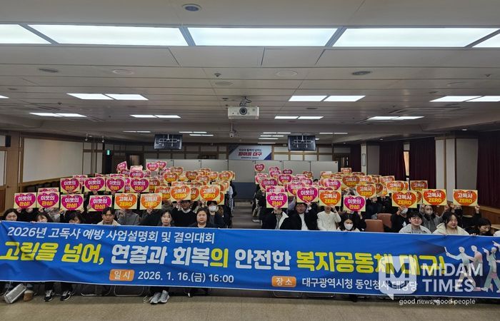 미담타임스 김교환 기자 | 대구광역시는 1월 16일, 시청 동인청사에서 9개 구·군 및 읍·면·동 고독사 예방사업 담당 공무원 160여 명이 참석한 가운데 ‘2026년 고독사 예방 사업설명회 및 결의대회’를 개최했다.