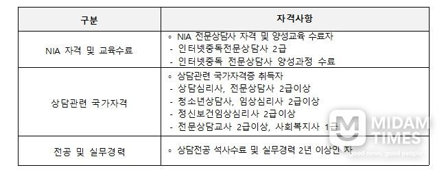 선발 자격은 ▲한국지능정보사회진흥원 시행 인터넷 중독 전문상담사 2급 자격증 소지자 ▲인터넷중독 전문인력 양성교육 이수자 등 관련 자격을 갖춘 인력이다.