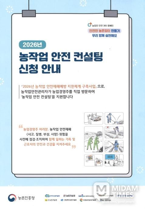 미담타임스 김준완 기자 | 안동시는 농업 분야 중대재해 예방과 안전한 농작업 환경 조성을 위해 '2026년 농작업 안전재해예방 지원체계 구축사업'의 일환으로 ‘농작업 안전보건관리 컨설팅’ 참여농가를 모집한다고 1월 16일(금) 밝혔다.
