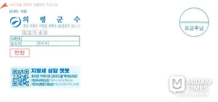 미담타임스 김교환 기자 | 의령군은 지방세 고지서 전면에 ‘지방세 챗봇 상담서비스’ QR코드를 삽입해 발송한다고 밝혔다.