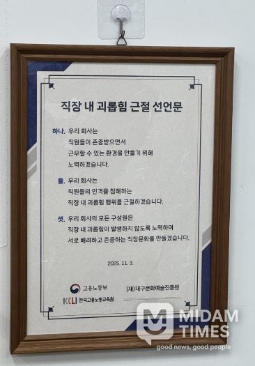 미담타임스 김교환 기자 | 대구문화예술진흥원이 고용노동부 산하 한국고용노동교육원이 주관한 ‘2025 찾아가는 직장 내 괴롭힘 예방교육 사업장 강사지원 교육 프로그램 수료 사업장’을 인증받았다.