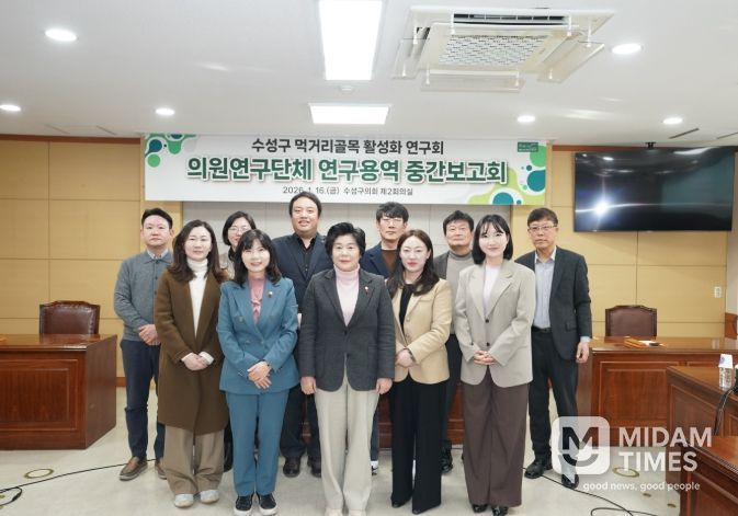 미담타임스 김교환 기자 | 수성구의회 의원연구단체인 ‘수성구 먹거리골목 활성화 연구회(회장 정대현 의원, 남정호ㆍ김중군ㆍ김재현ㆍ정경은ㆍ최명숙 의원)’는 지난 16일 의회 2층 회의실에서 '수성구 먹거리골목 활성화 모델 마련' 연구용역 중간보고회를 개최했다.