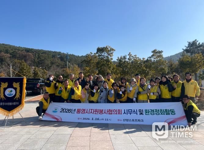 미담타임스 김교환 기자 | 통영시자원봉사협의회는 지난 16일 산양스포츠파크 일원에서 2026년 시무식과 함께 환경정화활동을 진행하며 새해 공식 활동의 막을 올렸다.