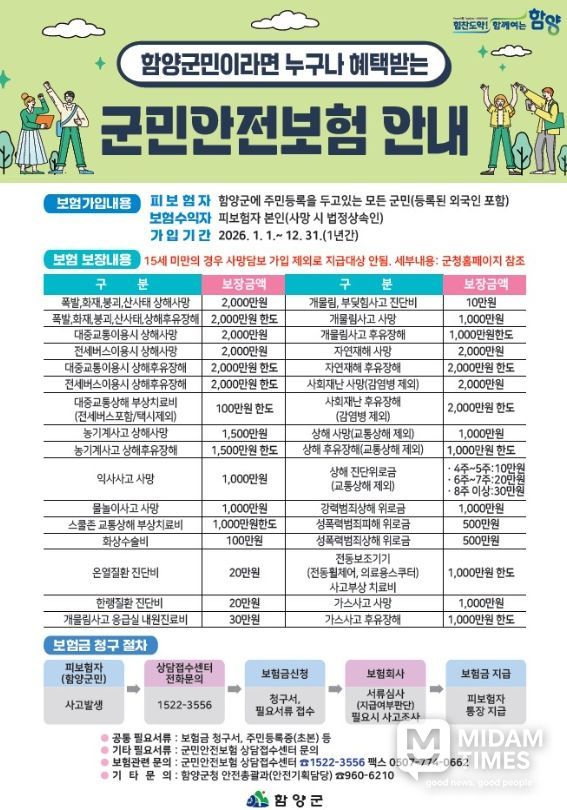 미담타임스 김교환 기자 | 함양군은 군민들이 일상생활 속 각종 재난·사고로부터 보다 안전하게 보호받을 수 있도록 전 군민을 대상으로 한 ‘2026년 군민안전보험’에 가입해 운영한다고 밝혔다.