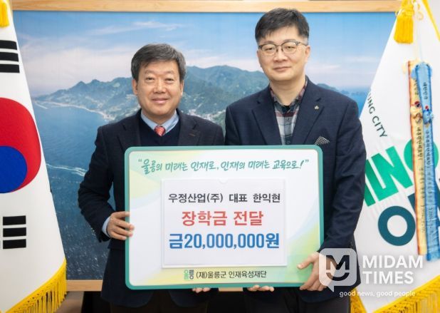미담타임스 김준완 기자 | 지난 20일 화요일 오전 9시, 울릉군청을 방문한 우정산업(주)는 (재)울릉군인재육성재단(이사장 남한권)에 장학금 2,000만 원을 기탁했다.