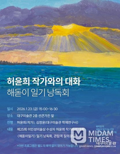 미담타임스 김교환 기자 | 대구문화예술진흥원 대구미술관은 제25회 이인성미술상 수상자전 ‘허윤희: 가득찬 빔’의 전시 연계 프로그램으로 ‘허윤희 작가와의 대화: 해돋이 일기 낭독회’를 1월 23일 오후 3시, 대구미술관 2층 선큰가든에서 개최한다.
