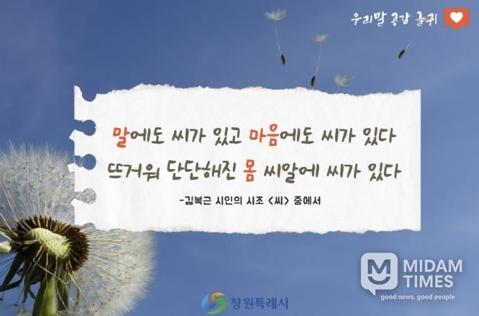 미담타임스 김교환 기자 | 창원특례시는 각종 홍보 매체를 통해 소개할 우리말 공감 글귀 ‘봄편’ 문안을 23일부터 내달 4일까지 공개모집 한다.