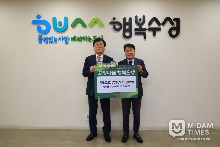 미담타임스 김교환 기자 | 장한건설(주)은 지난 21일 수성구청을 방문해 구민들이 행복한 한 해를 보내길 바라는 뜻을 담아 성금 500만 원을 기탁했다.