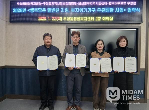 미담타임스 김준완 기자 | 울산 중구 우정동 행정복지센터와 우정동 지역사회보장협의체가 지난 1월 22일 오후 4시 우정동 행정복지센터 회의실에서 울산중구지역자활센터와 ‘행복담은 밑반찬 지원 사업’, 한국야쿠르트 우정점과 ‘복지위기가구 우유배달 지원사업’ 업무협약을 체결했다.