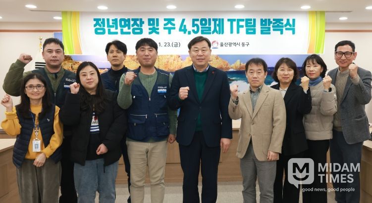 미담타임스 김준완 기자 | 울산 동구는 1월 23일 오후 4시 동구청 상황실에서 구청장을 비롯해 자치단체공무직본부 동구지회장, 조합원 등 기관 및 노조 관계자 10명이 참석한 가운데 ‘정년연장 및 주 4.5일제 논의를 위한 TF팀 발족식’을 개최했다.
