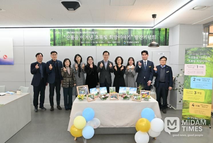 미담타임스 김준완 기자 | 경북교육청은 26일 본청 라운지 102에서 2025년 봄 대형 산불로 큰 피해를 입은 교육 현장의 대응과 극복 과정을 담은 산불 대응 수범 사례집 ‘산불을 이겨낸 초록빛 희망이야기’를 발간하고, 이를 기념하는 뜻깊은 자리를 마련했다고 밝혔다.