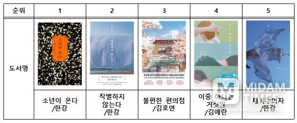 『작별하지 않는다』, 『채식주의자』 등 한강 작가의 작품이 다수 상위권에 오르며 꾸준한 독서 흐름을 보였다.