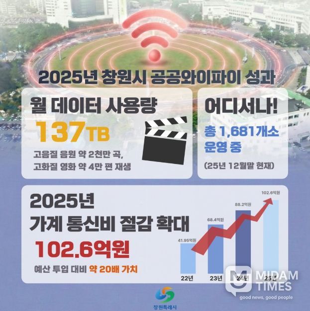 미담타임스 김교환 기자 | 창원특례시가 시 전역 1,681개소에 설치·운영 중인 공공와이파이의 2025년 성과를 분석한 결과, 지난해보다 20.4억원이 증가한 102.6억원의 가계 통신비 절감을 이뤘다고 밝혔다.