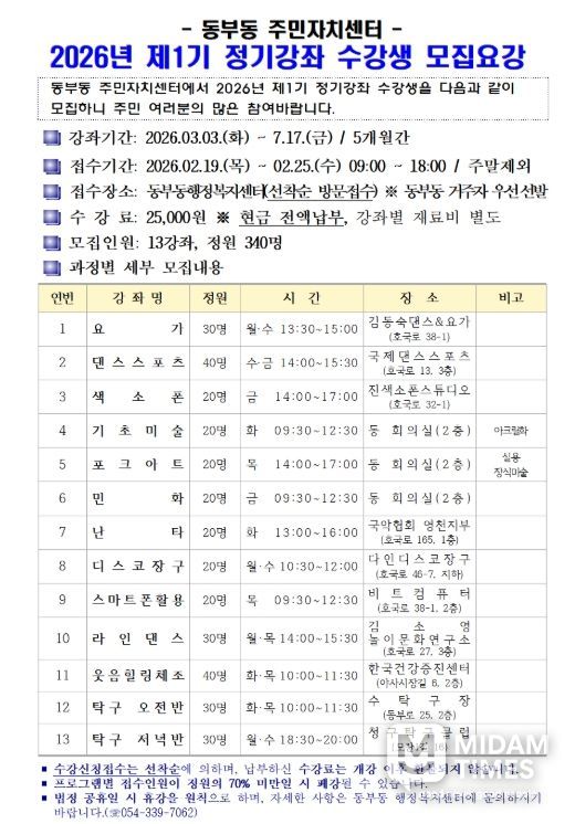 미담타임스 김준완 기자 | 영천시 동부동 주민자치위원회는 오는 2월 19일부터 25일까지 ‘2026년 제1기 정기강좌’ 수강생을 모집한다고 밝혔다.