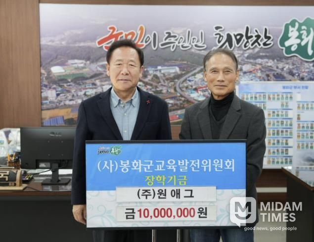 미담타임스 김준완 기자 | 봉화군에 소재한 ㈜원애그는 2월 4일 봉화군청을 방문해 지역 교육발전과 인재 육성을 위해 (사)봉화군교육발전위원회에 장학금 1천만원을 기탁했다.