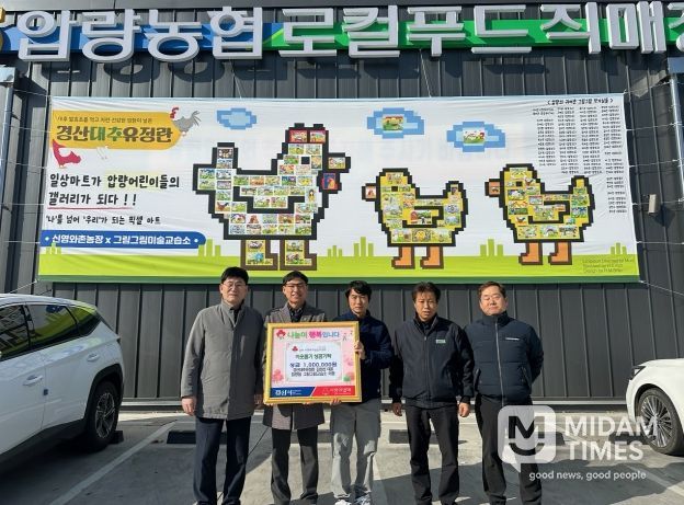 미담타임스 김준완 기자 | 경산대추유정란 김현섭대표는 29일 압량읍 행정복지센터에 이웃돕기성금 100만 원을 기탁했다. 기탁은 압량농협 하나로마트의 지원을 받아 압량농협 로컬푸드직매장에서 진행됐으며 기탁과 동시에 아동들의 그림과 이름을 담은 픽셀아트도 같이 전시했다.