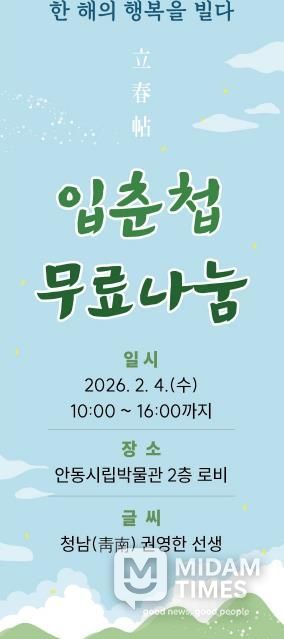 미담타임스 김준완 기자 | 안동시립박물관은 2026년 입춘을 맞아, 박물관을 찾는 관람객들을 대상으로 ‘입춘첩(立春帖)’ 무료 나눔 행사를 2월 4일 오전 10시부터 오후 4시까지 진행한다.