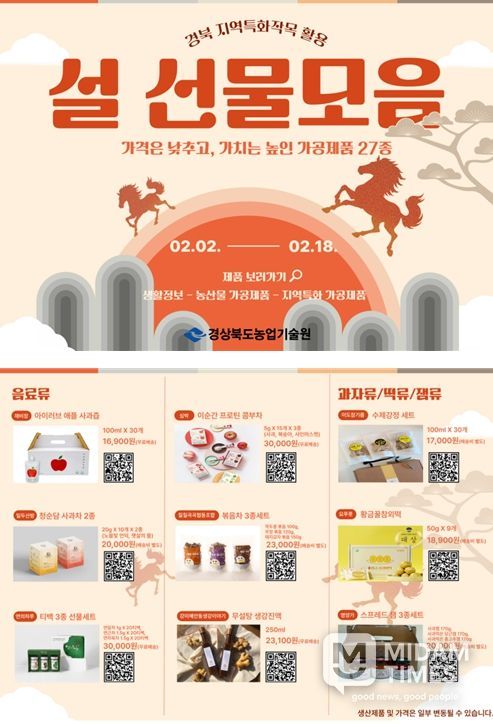 제품의 세부 정보와 구매처는 2월 2일부터 2월 18일까지 경상북도농업기술원 홈페이지 내‘지역특화 가공제품’페이지에서 확인할 수 있으며, QR코드를 스캔하면 판매처로 바로 연결돼 편리하게 구매할 수 있다.