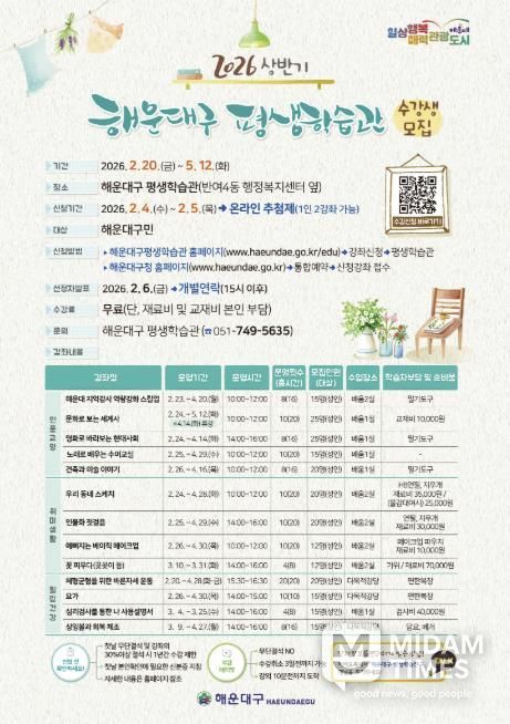 미담타임스 김교환 기자 | 해운대구는 지역 주민의 평생학습 참여 확대를 위해 2026년 평생학습관 상반기 프로그램 수강생을 모집한다.
