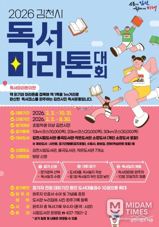 미담타임스 김준완 기자 | 김천시립도서관에서는 시민의 독서문화 증진과 도서관 이용 생활화 유도를 위해 2월 3일부터 10월 31일까지 9개월간의 여정으로 '독서마라톤 대회'와 '도서관 스탬프 투어'를 개최한다.