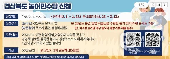 온라인 신청은 2월 1일부터 2월 22일까지 경상북도 공공서비스 플랫폼인 ‘모이소(Moiso)’ 앱을 통해 가능하며, 방문 신청은 2월 23일부터 3월 13일까지 주소지 읍·면 행정복지센터에서 접수할 수 있다.